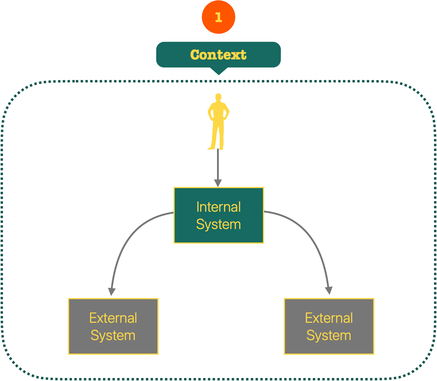 The System Context diagram is the big picture. It shows how your system interacts with users and other systems. Imagine a box in the centre representing your software, surrounded by other boxes that depict external systems and users.