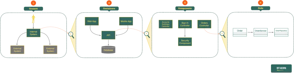 Each level provides a different view of the system, allowing you to zoom in from the high-level context to the detailed code.